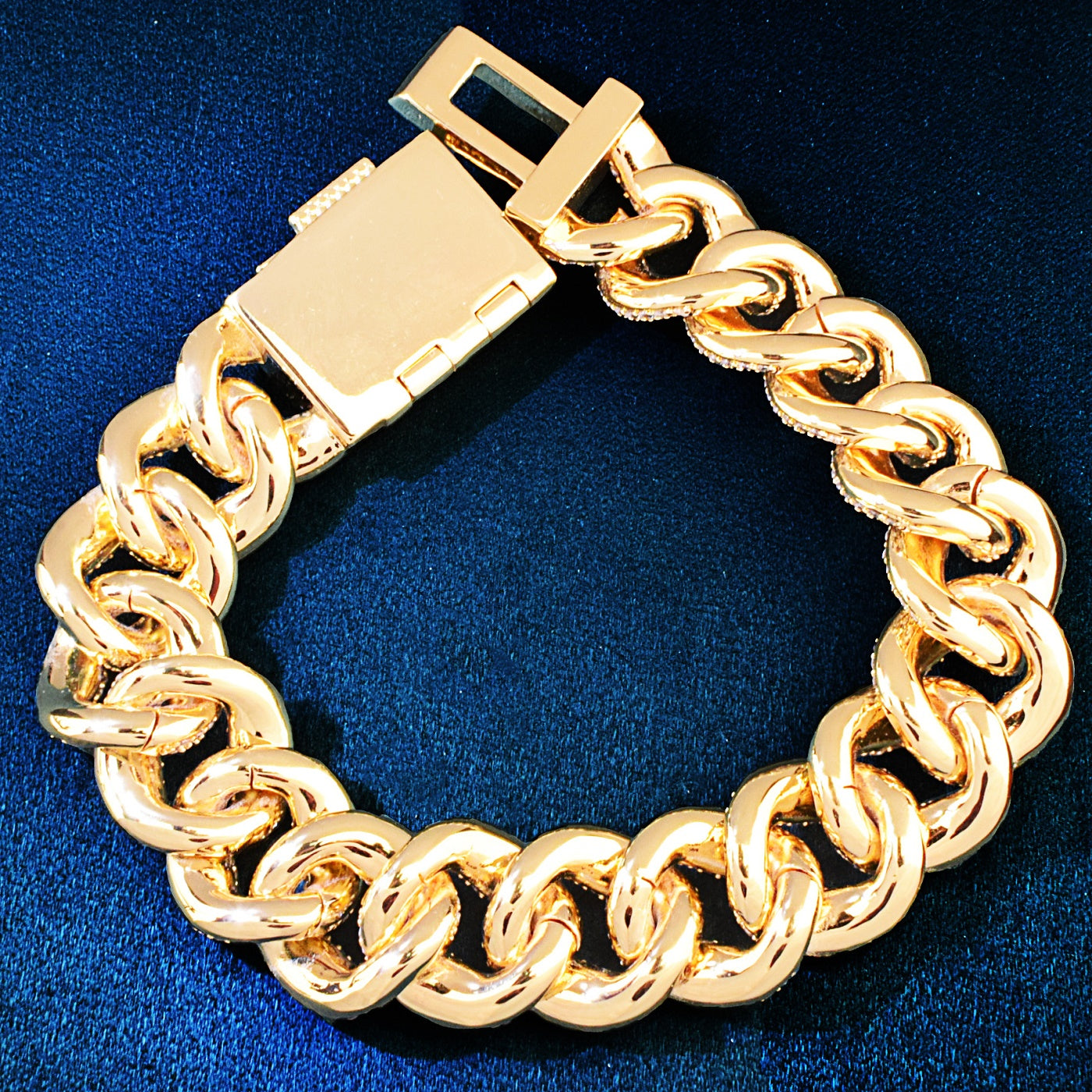 How iced out are you? Get your shine on with our 19mm Full Zircon Miami Cuban Bracelet. This bracelet is crafted with high quality gold plating and adorned with cubic zirconia stones for maximum bling. It's the perfect accessory to make a statement and show off your style. Whether you're hitting the town or just chillin' with your squad, this bracelet will turn heads and start conversations. So get one before they're all gone.