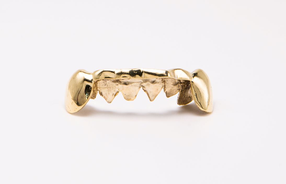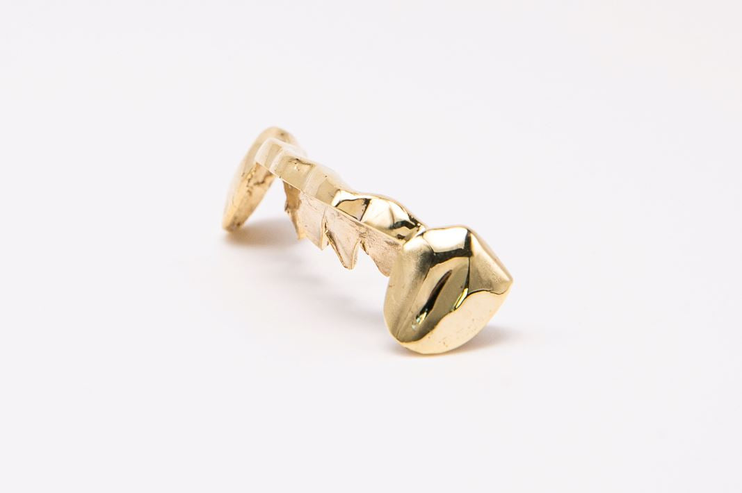 The Bridge can be made in 10K, 14K or 18K Solid Yellow Gold and features a two tooth design with an overlay connecting over the remaining bottom teeth in between. Also available in .925 Sterling Silver, Rose Gold and White Gold. This piece will give you the extra style you want! All of our pieces are 1/1 and are completely custom fitted to your teeth!